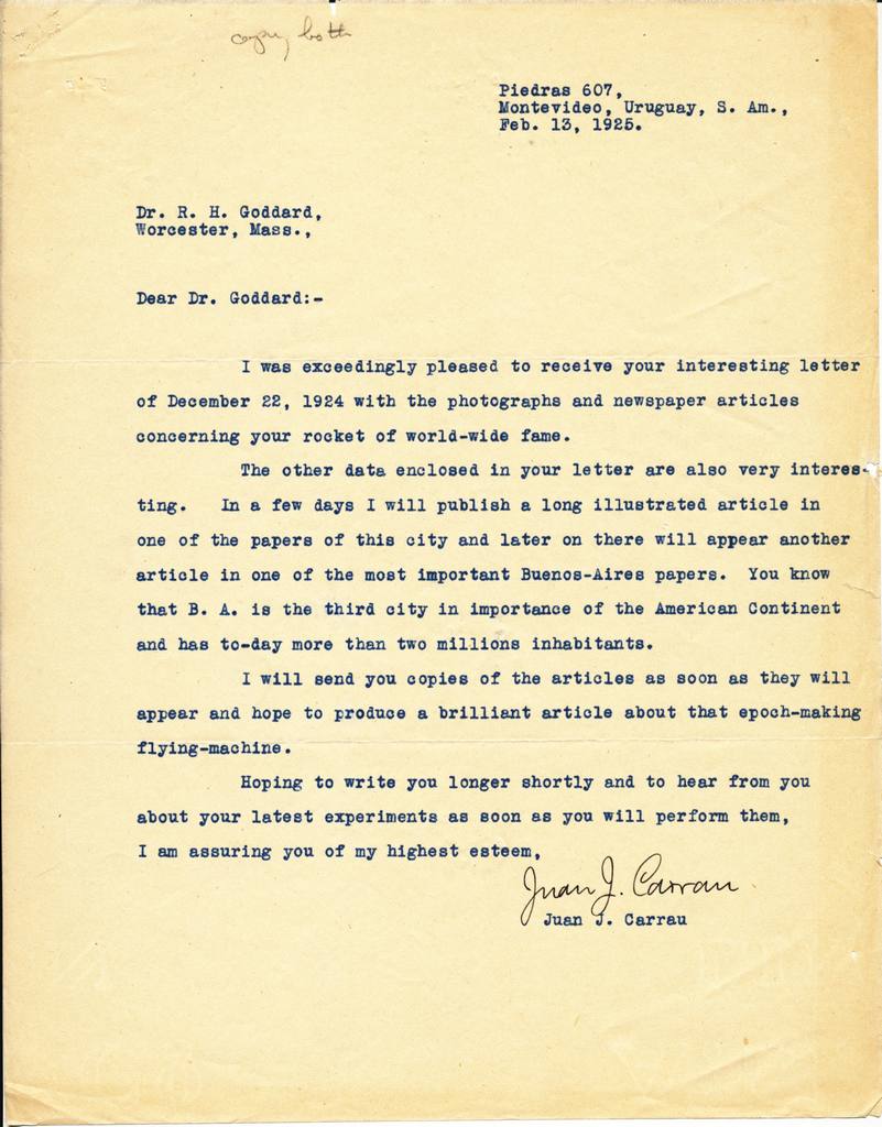 After my return to Montevideo, I maintained a long correspondence with Dr. Goddard, and I had published several articles about him in the paper "Imparcial", which I still retain. (One of the letters sent to Dr. Goddard courtesy of Clark University Archives. Thank you!)